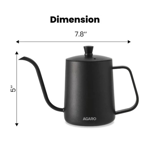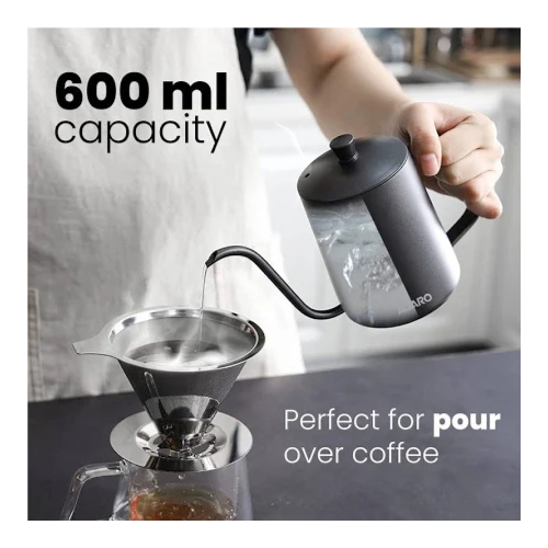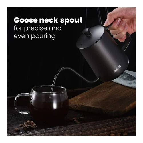 This gooseneck kettle is a specialized type of kettle designed with a long, narrow, curved spout that resembles the neck of a goose.